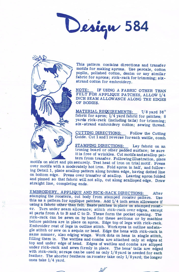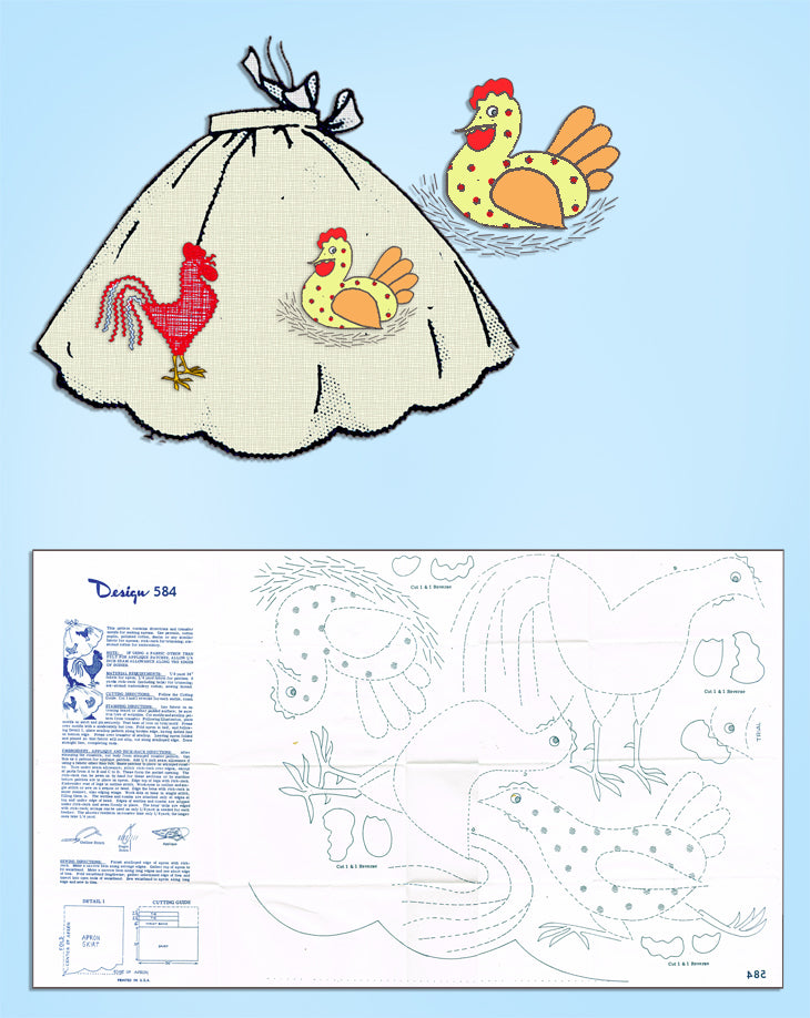 Design 584: 1950s Uncut Misses Chicken Apron Fits All Vintage Embroidery Transfer