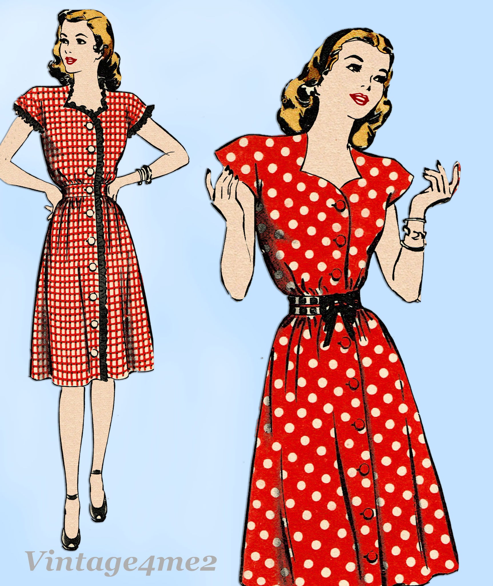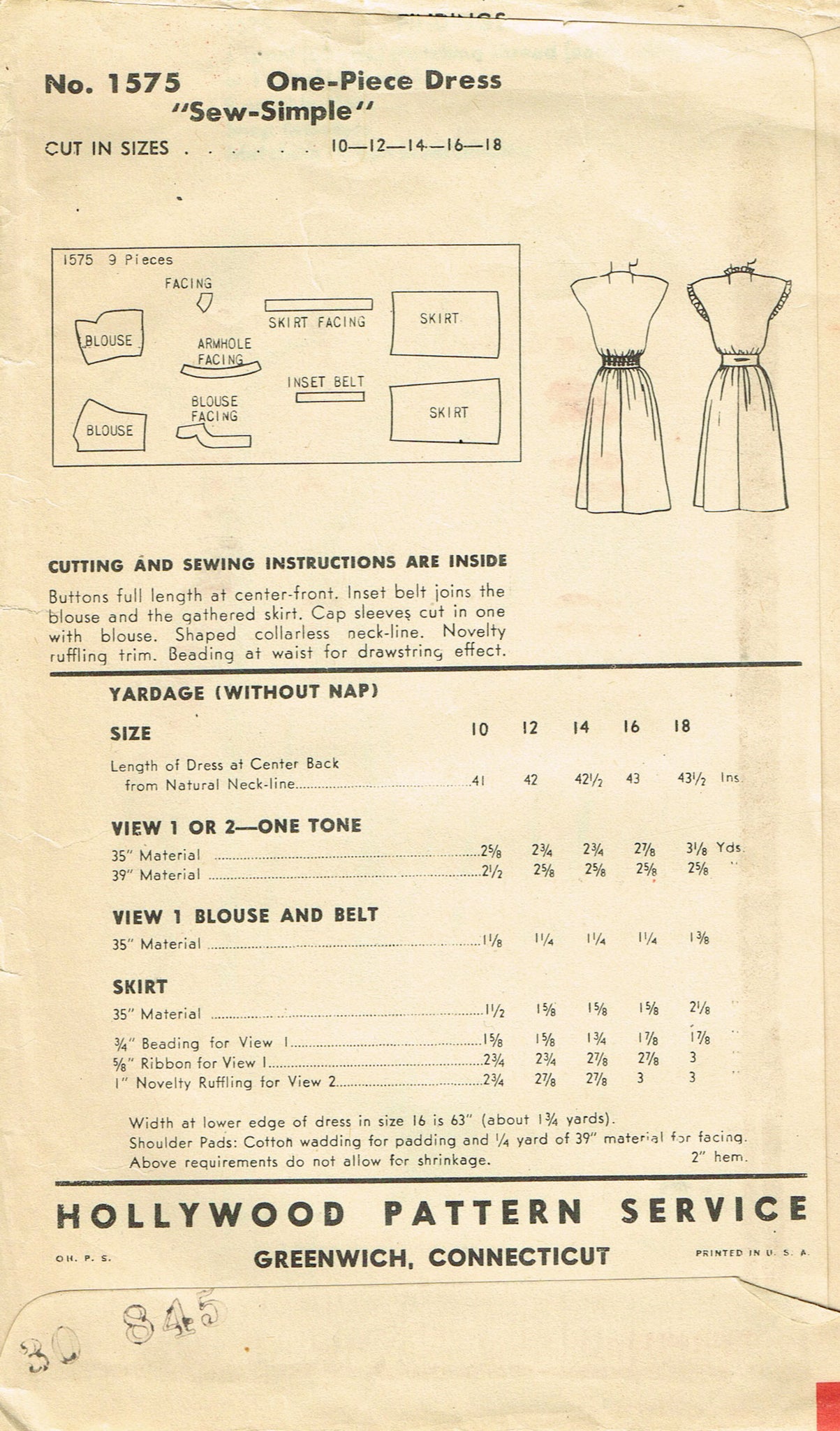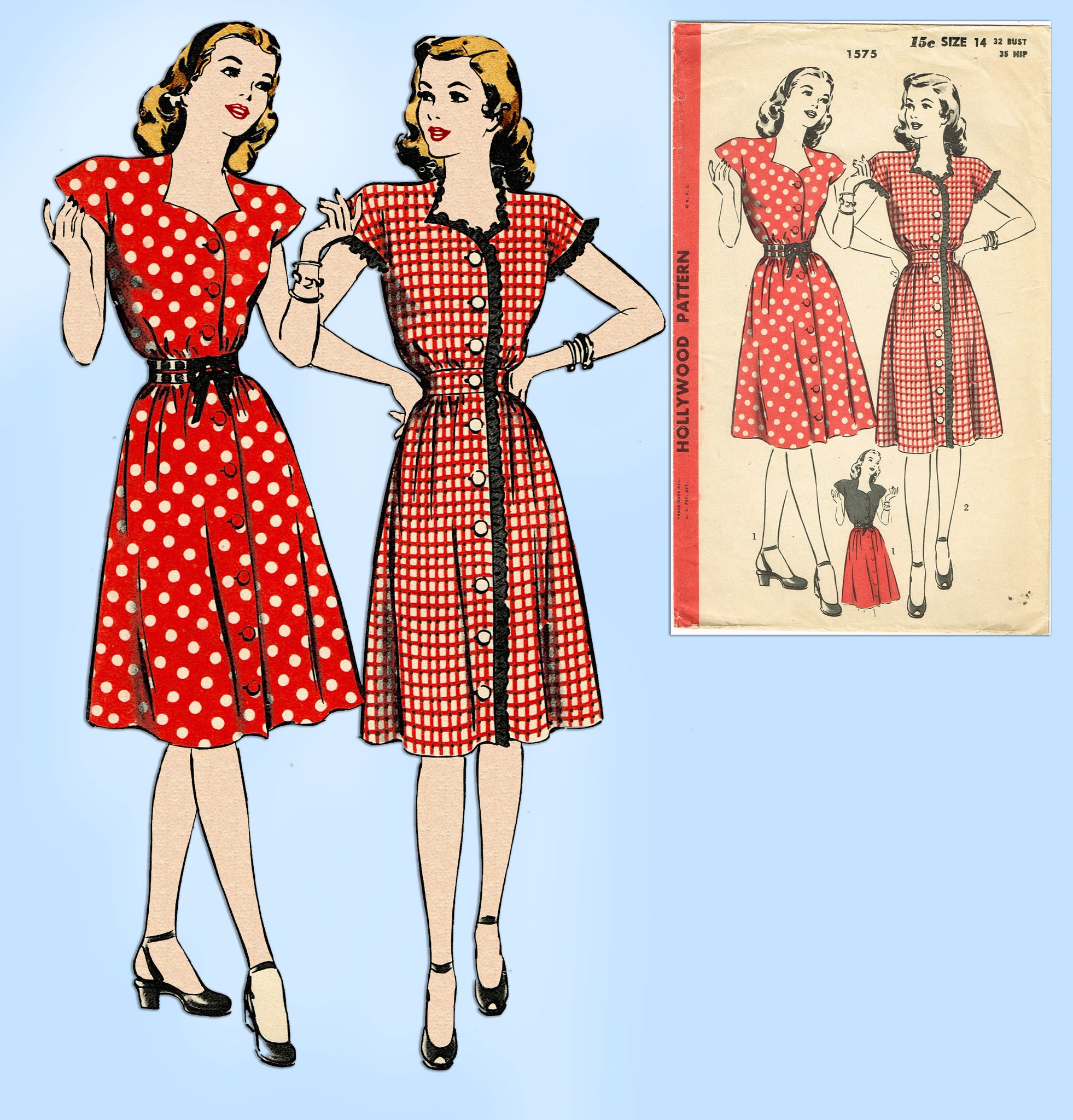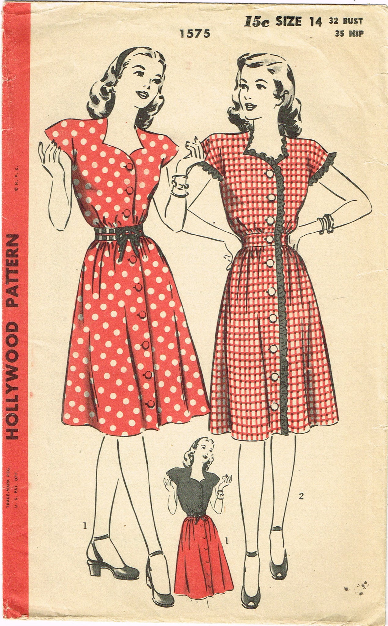 Hollywood 1575: 1940s Misses WWII Sweetheart Dress Sz 32B Vintage Sewing Pattern