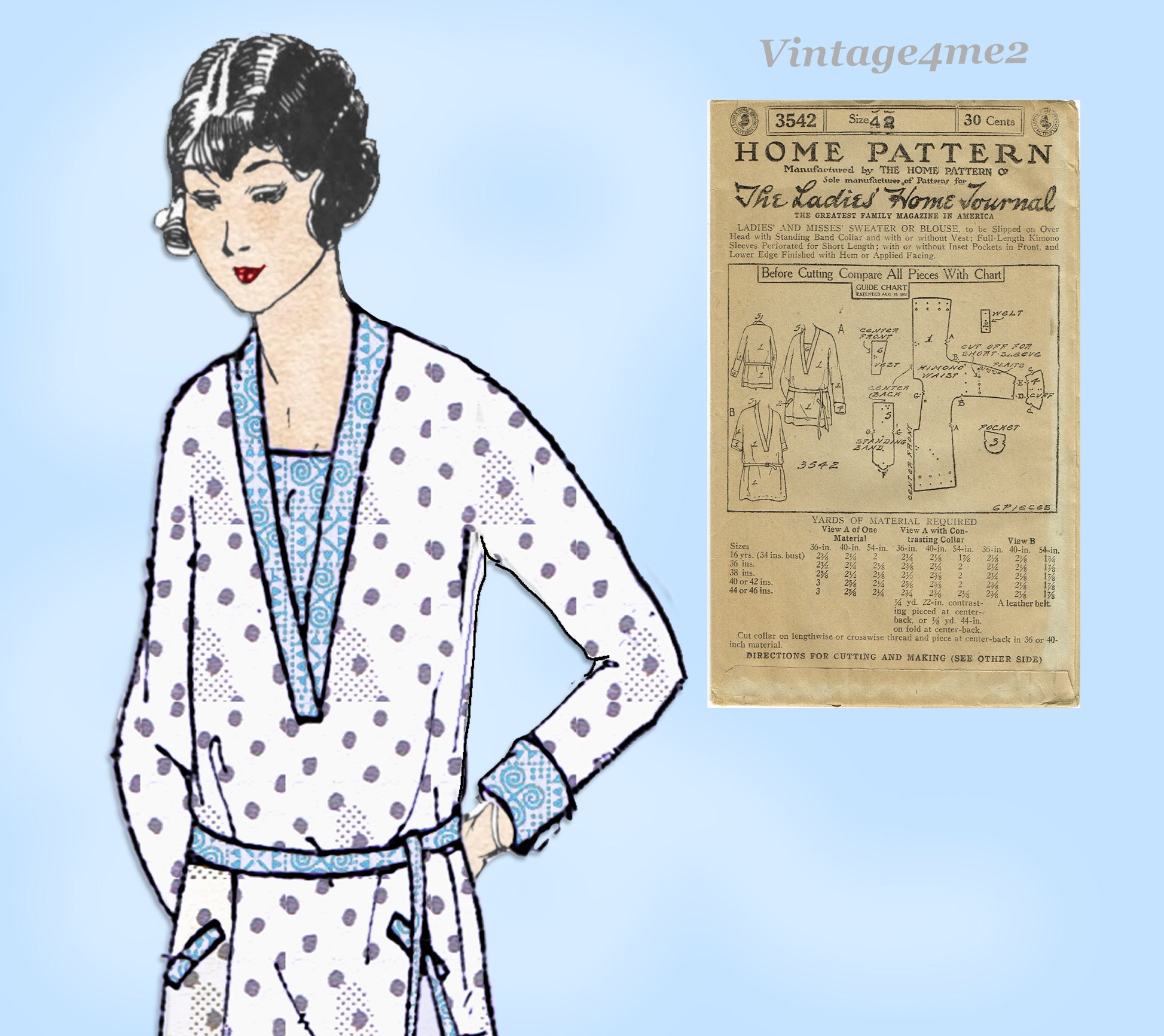 Ladies Home Journal Sewing Pattern 3542 Charming Misses Blouse Pattern with Long or Short Sleeves Late Downton Abbey Period Post-Edwardian From 1923 1924