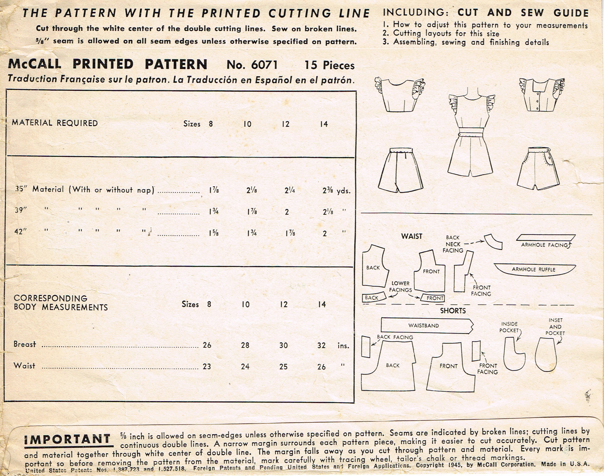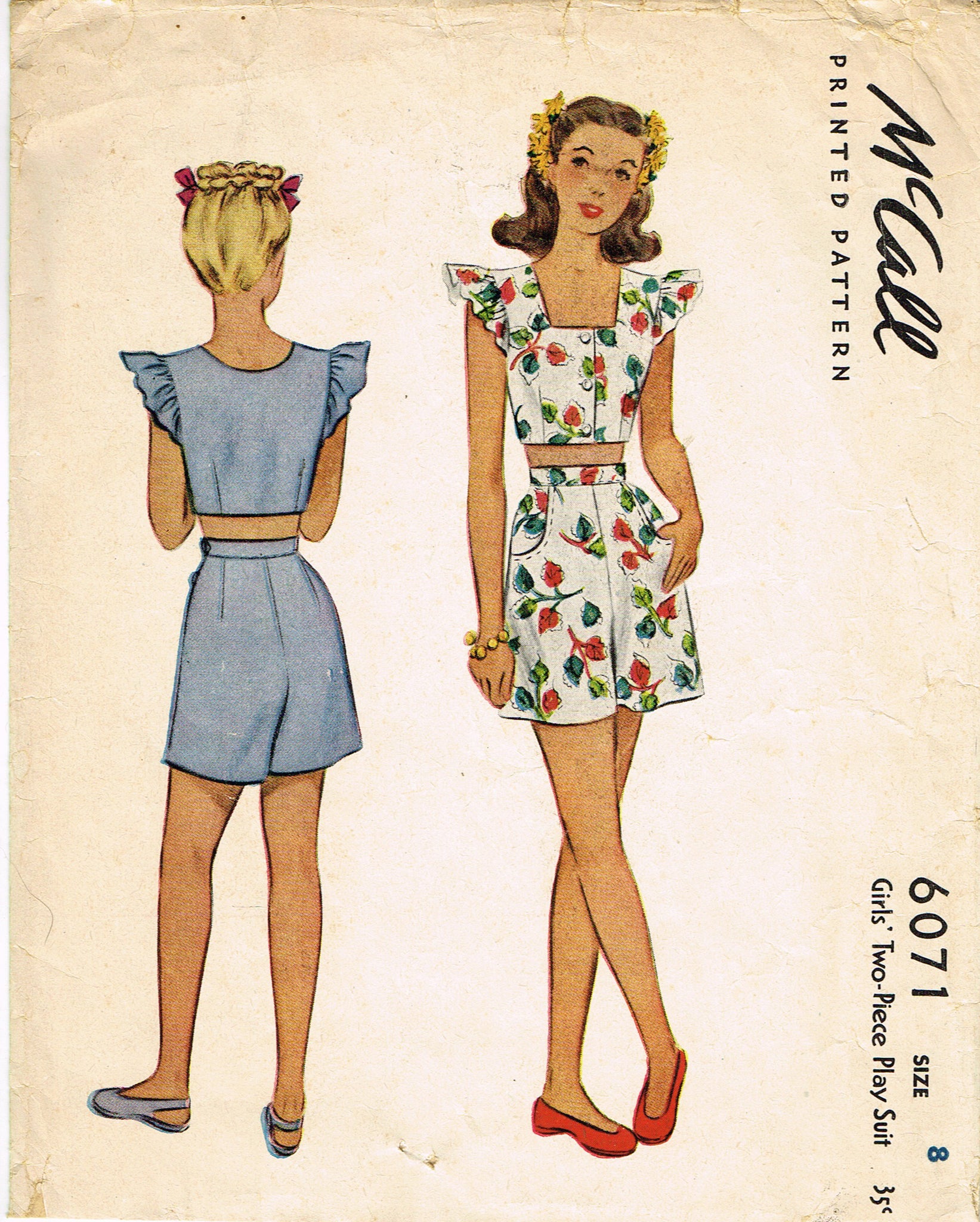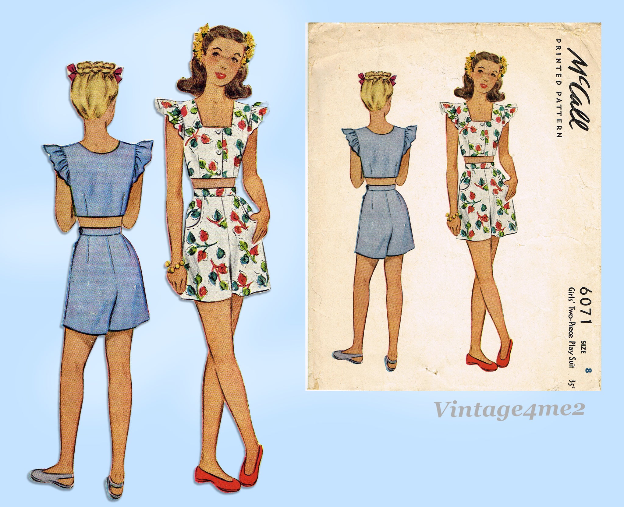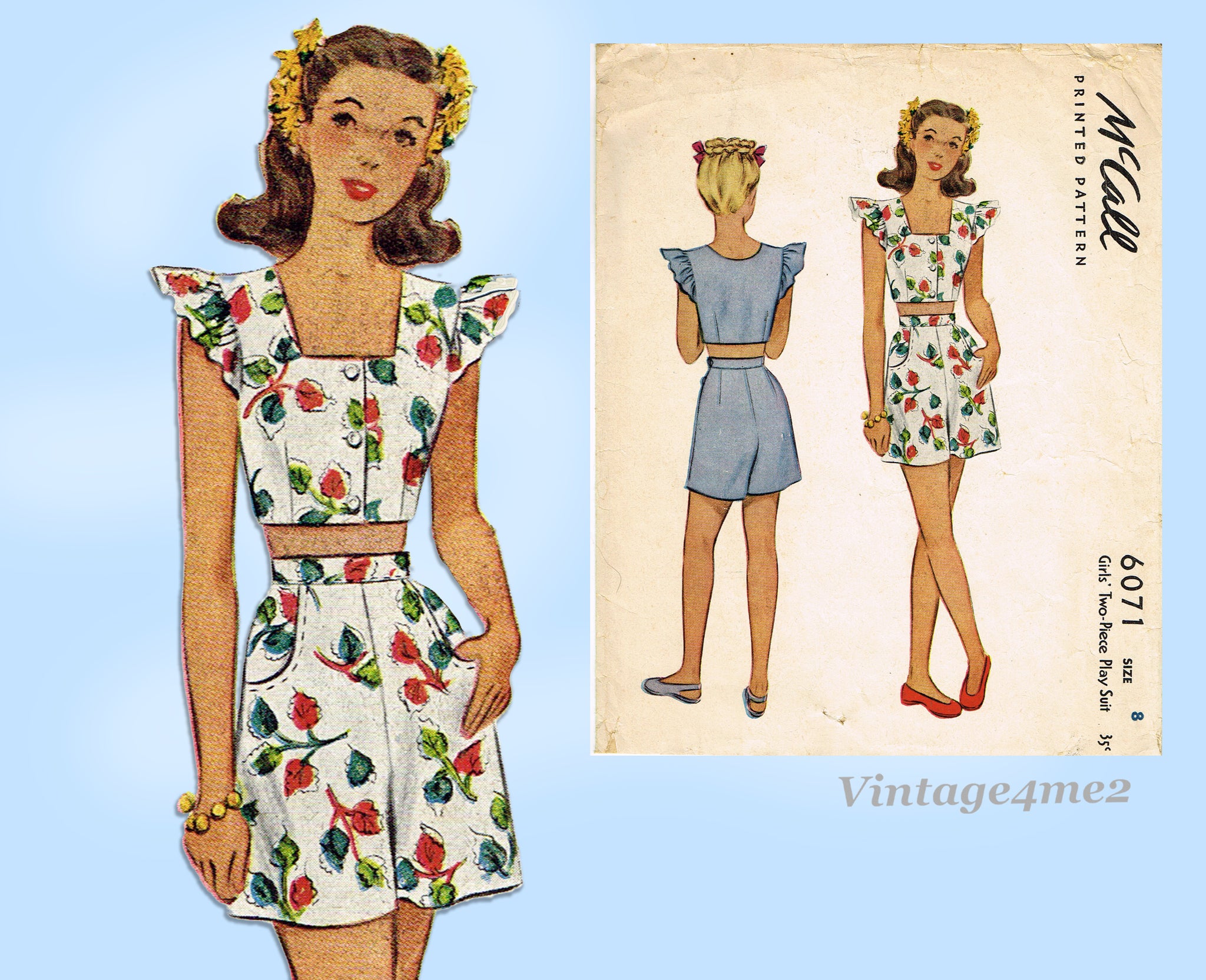 McCall 6071: 1940s Rare WWII Girls 2 Piece Playsuit Sz 8 Vintage Sewing Pattern