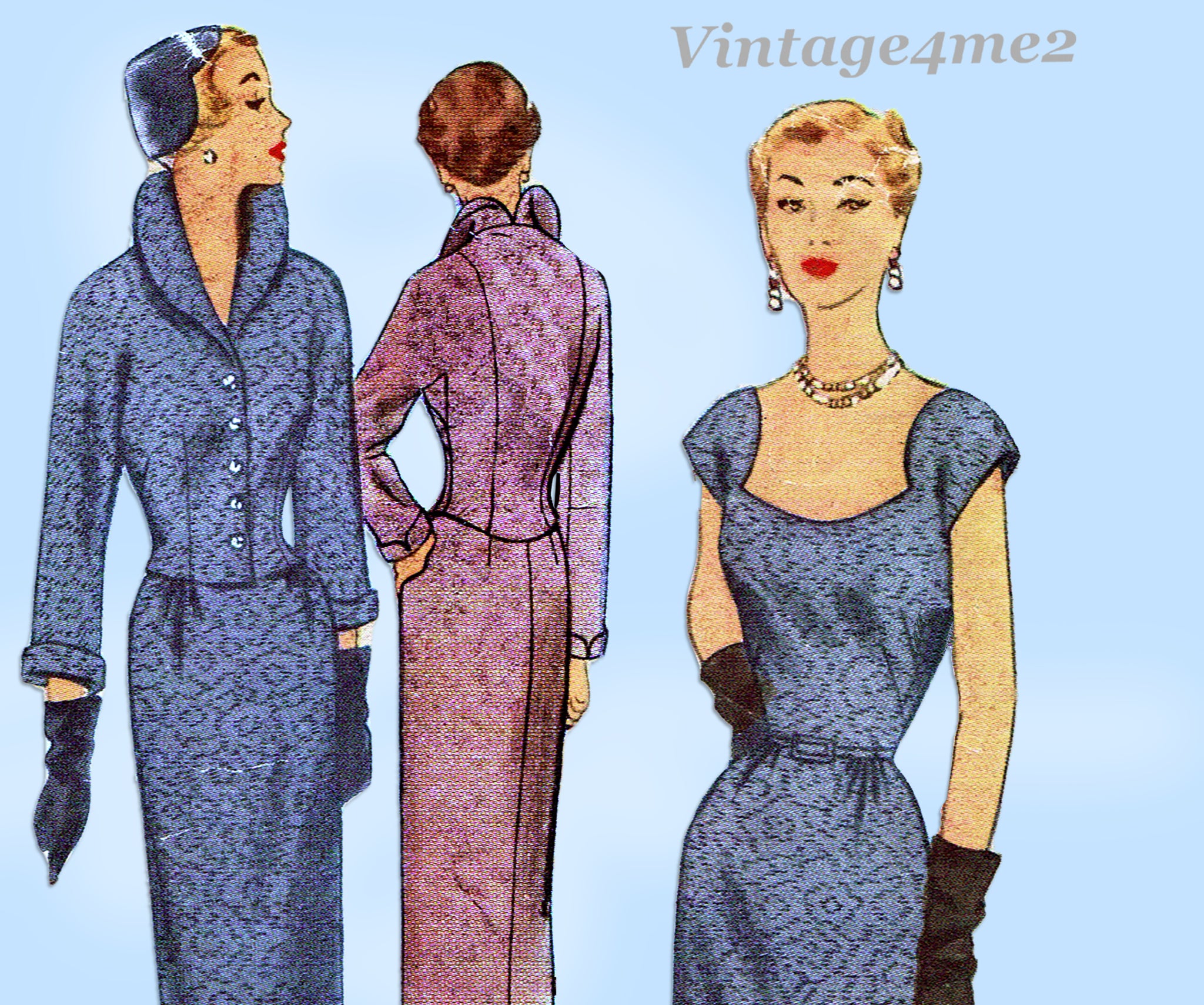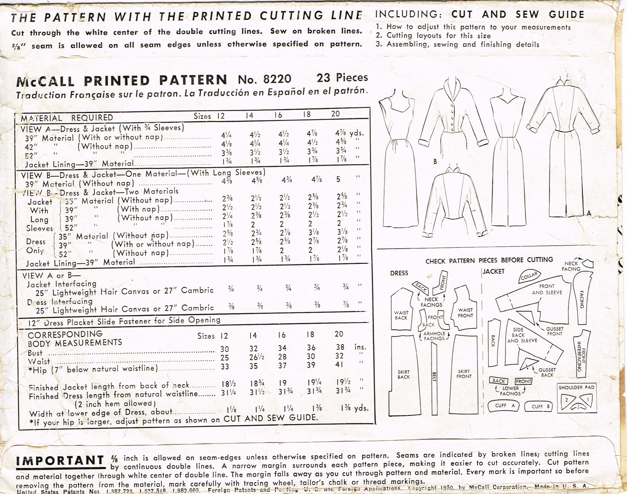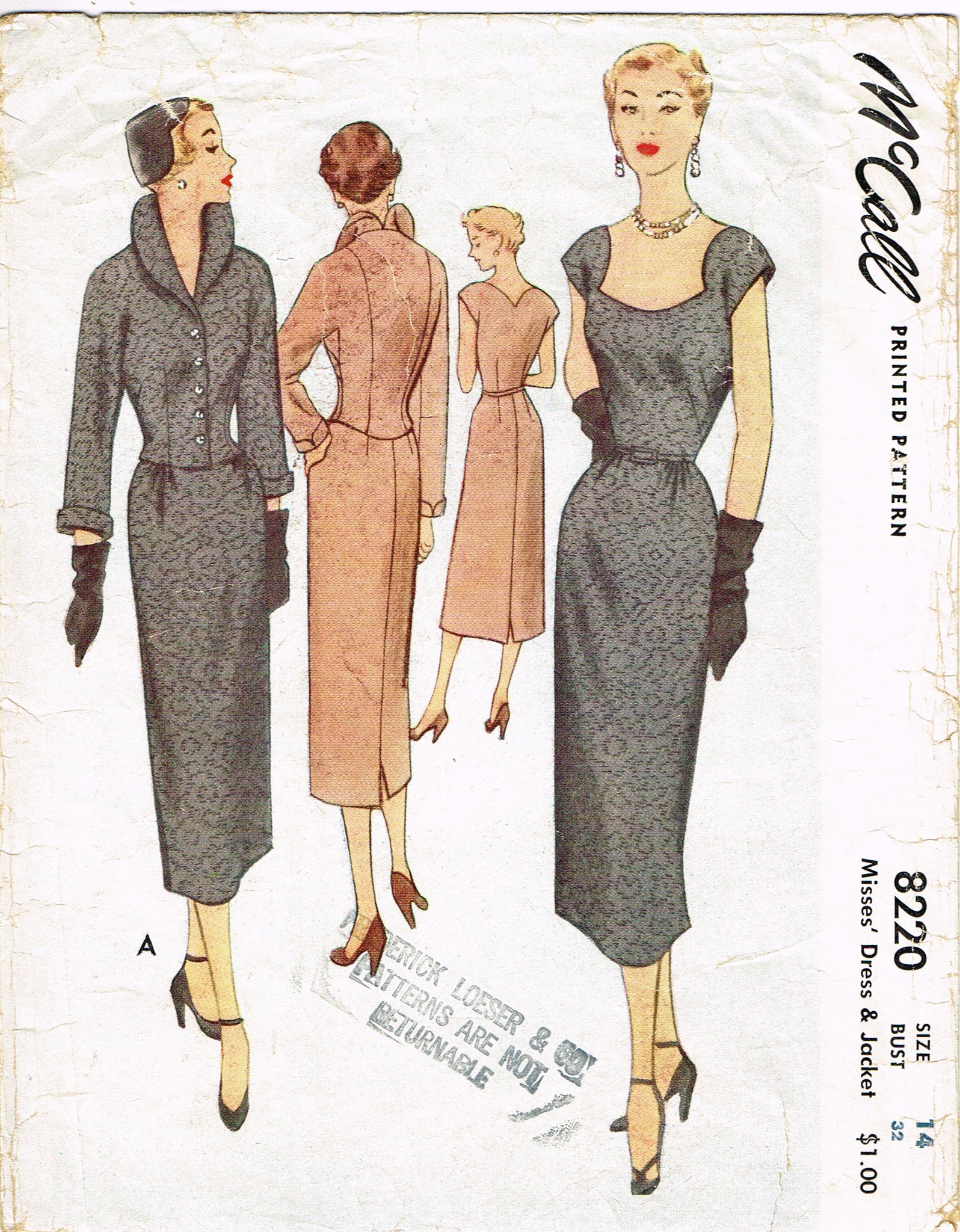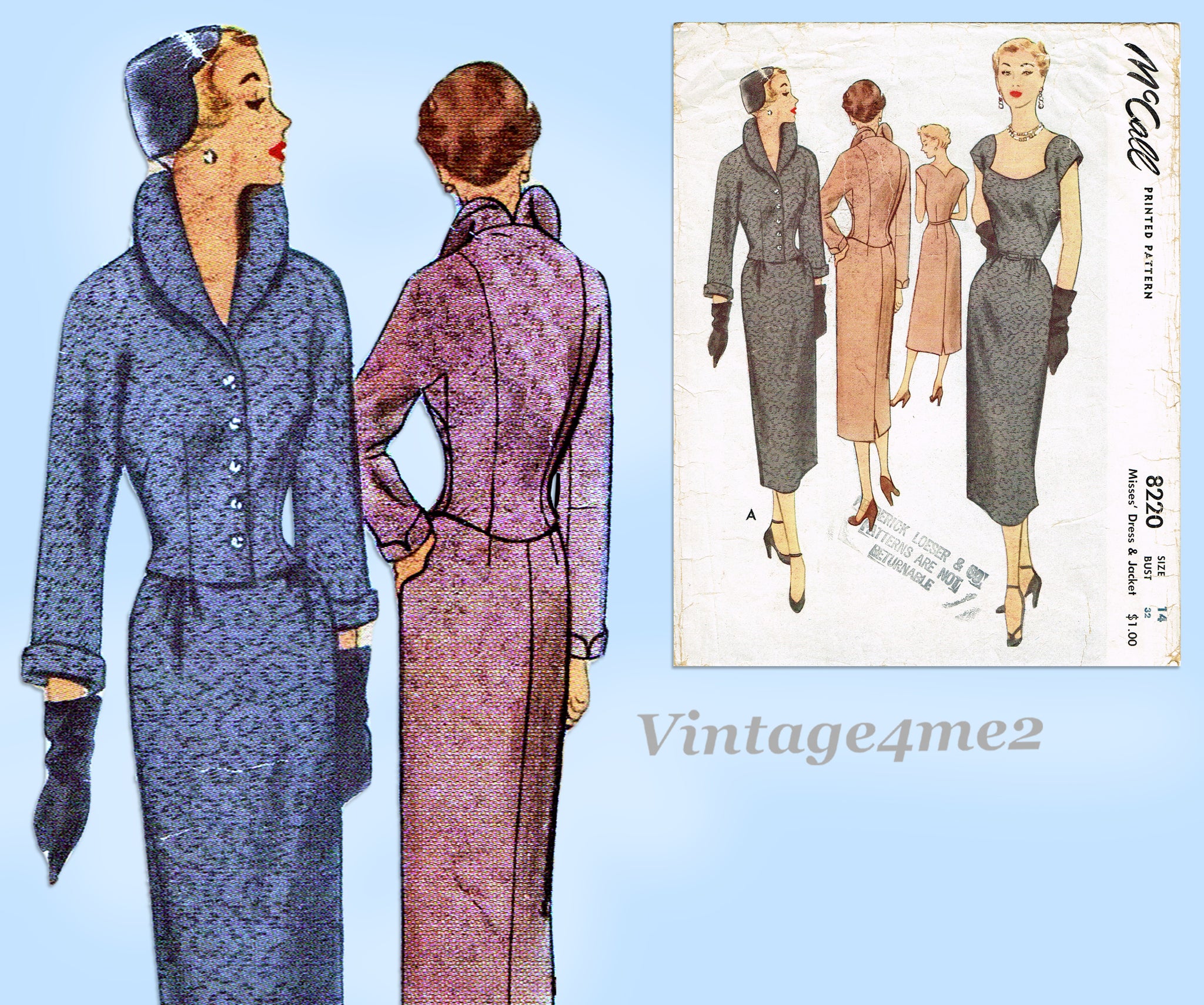 McCall 8220: 1950s Stylish Misses Dress & Jacket Sz 32 B Vintage Sewing Pattern