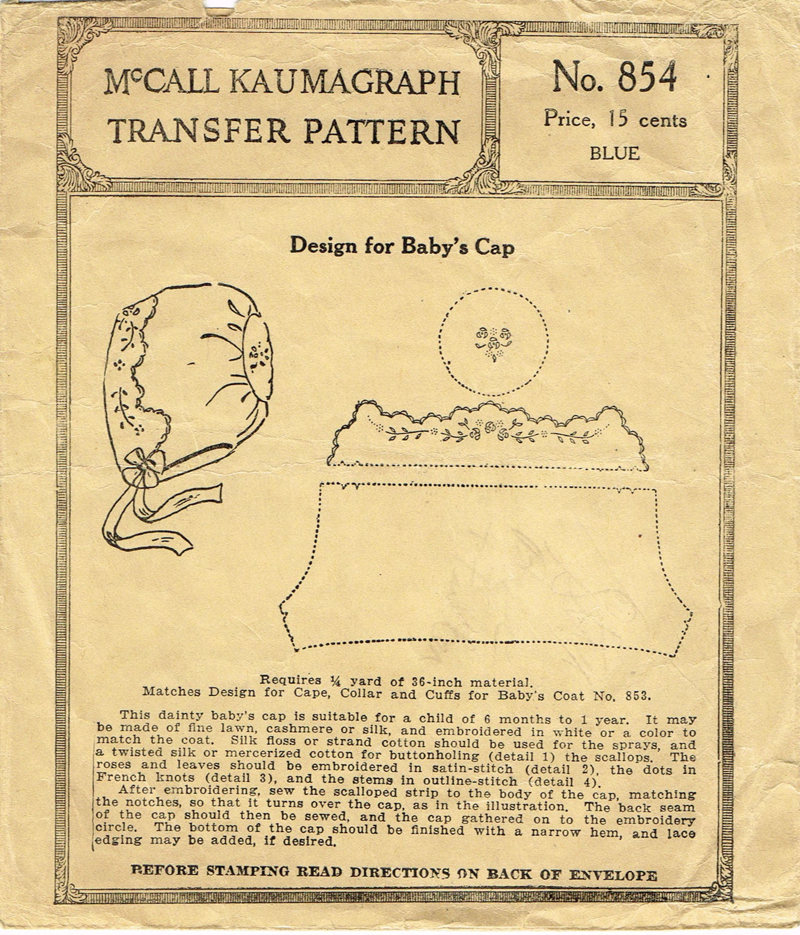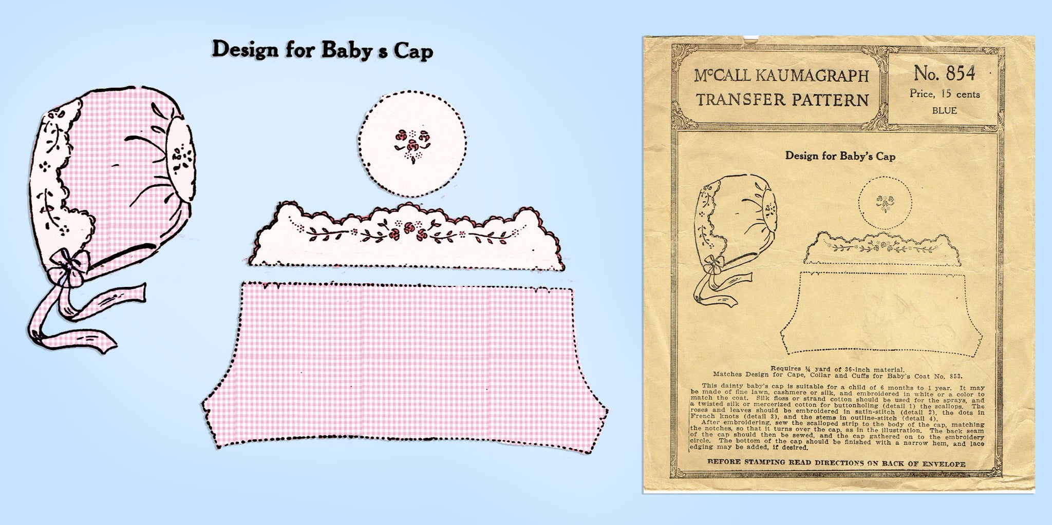 McCall 854: 1920s Sweet Baby Cap or Bonnet Rare Antique Vintage Sewing Pattern