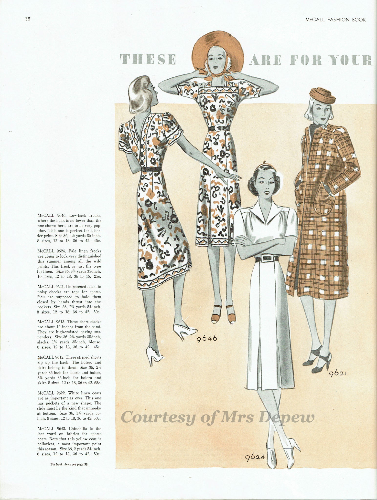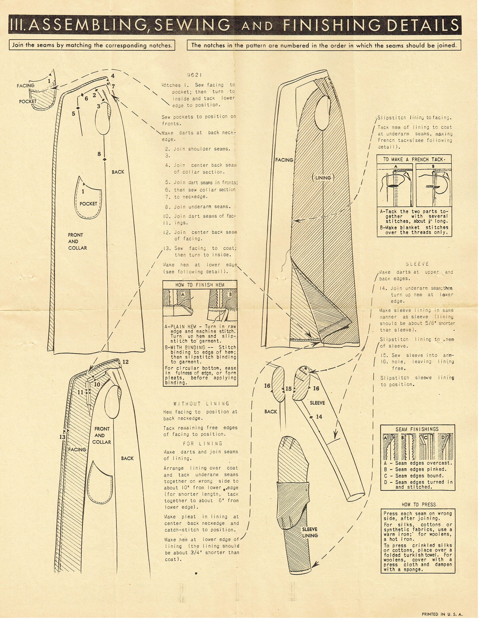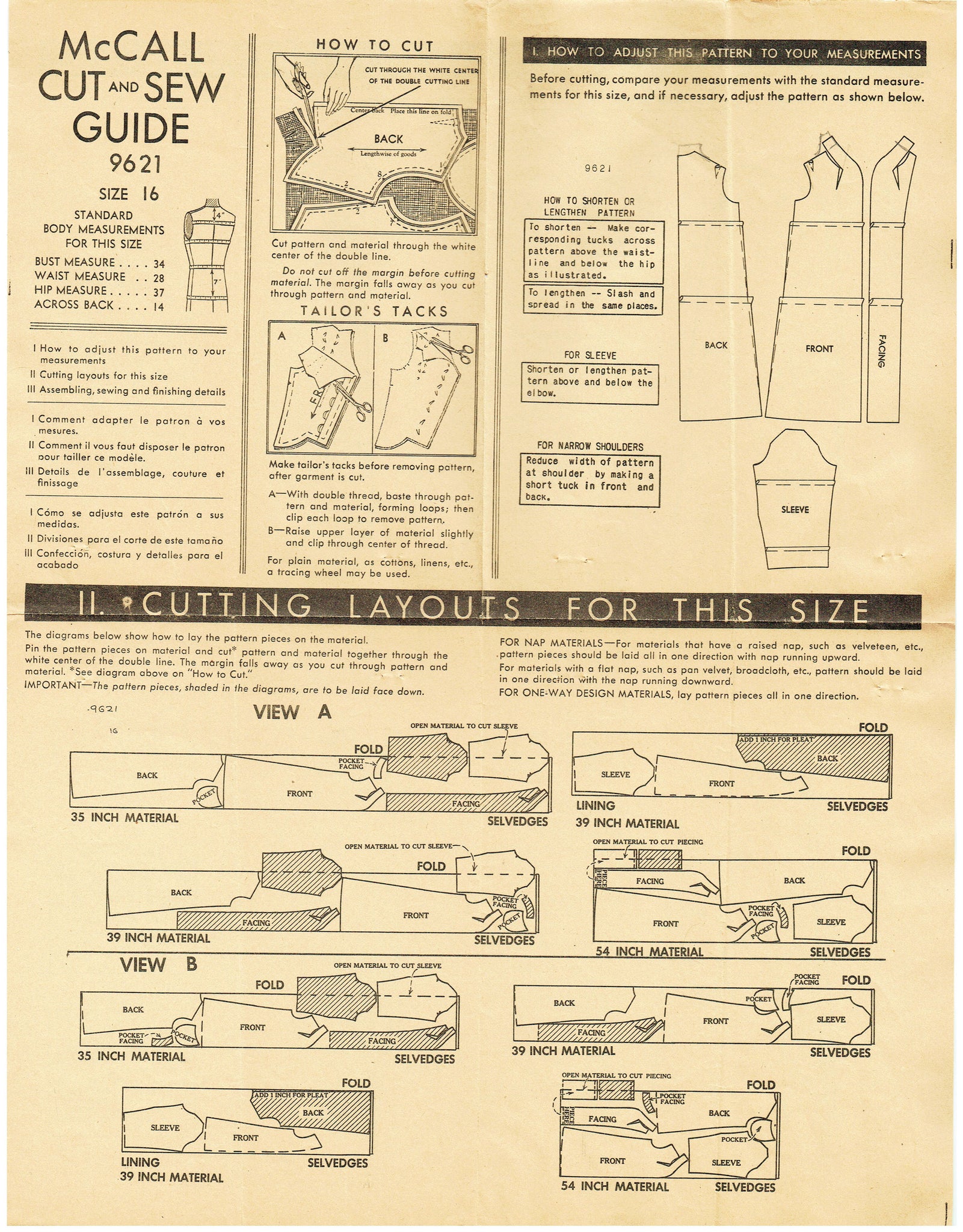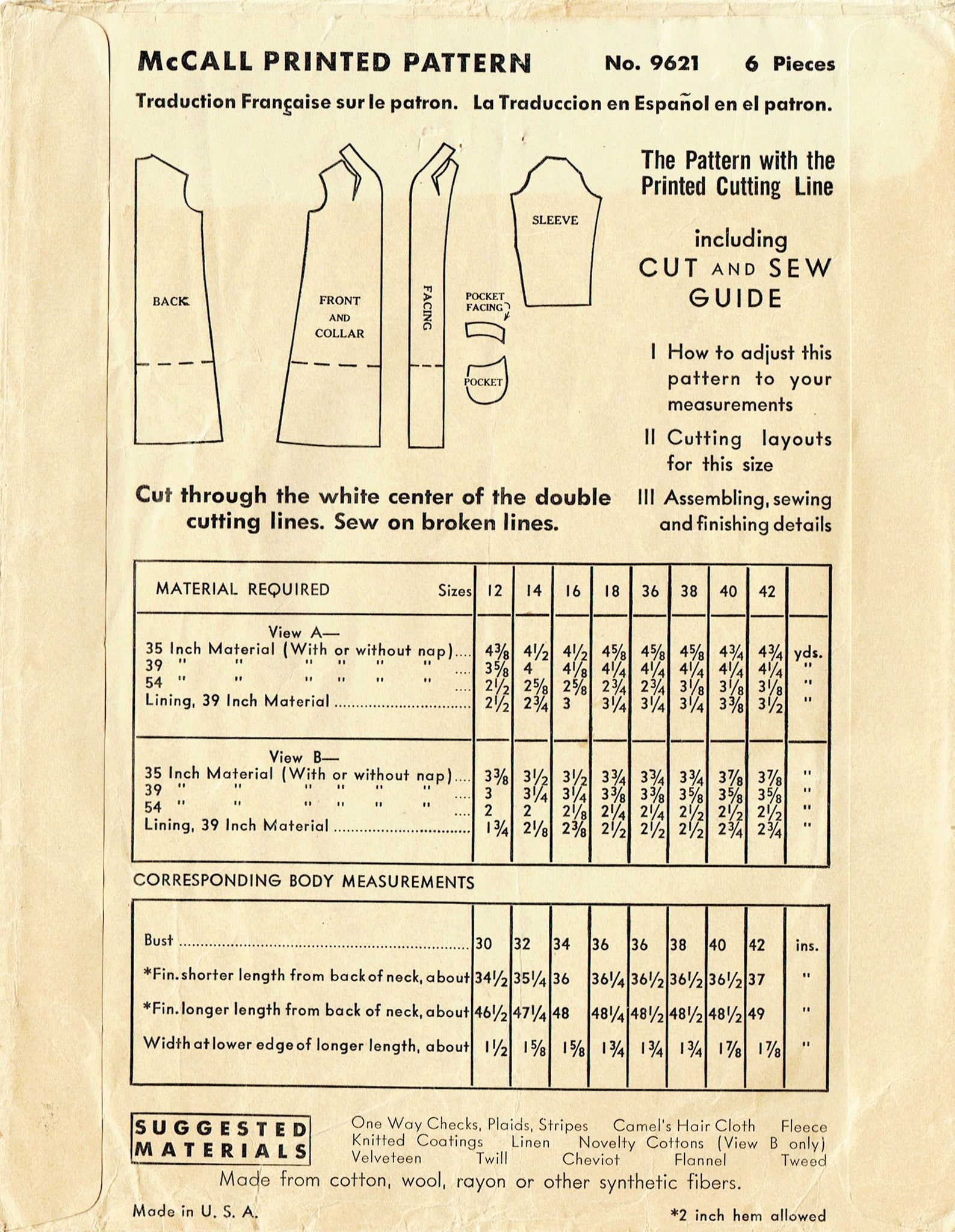 McCall Pattern 9621: 1930s Misses Long Lean Coat Sz 34 B Vintage Sewing Pattern