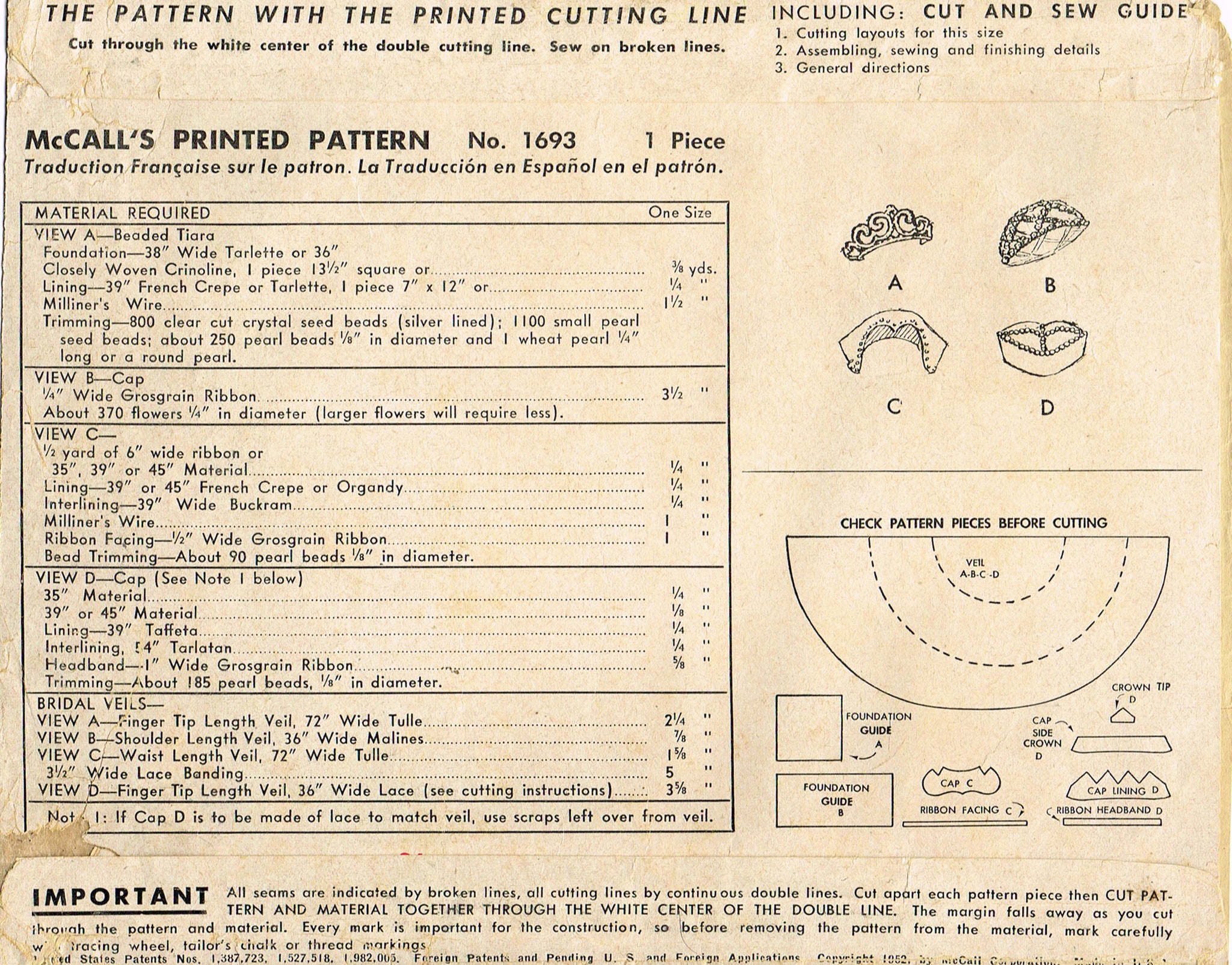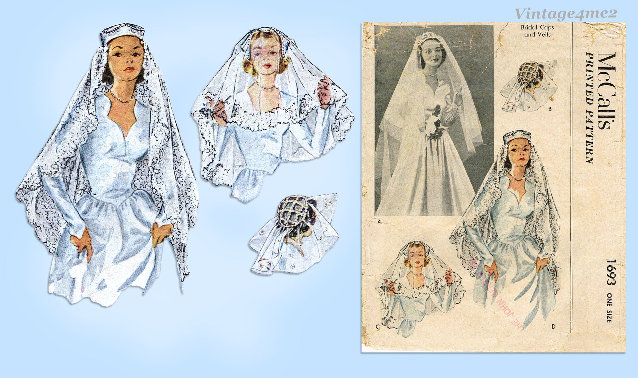 McCall's 1693: 1950s Stunning Misses Bridal Caps & Veils Vintage Sewing Pattern