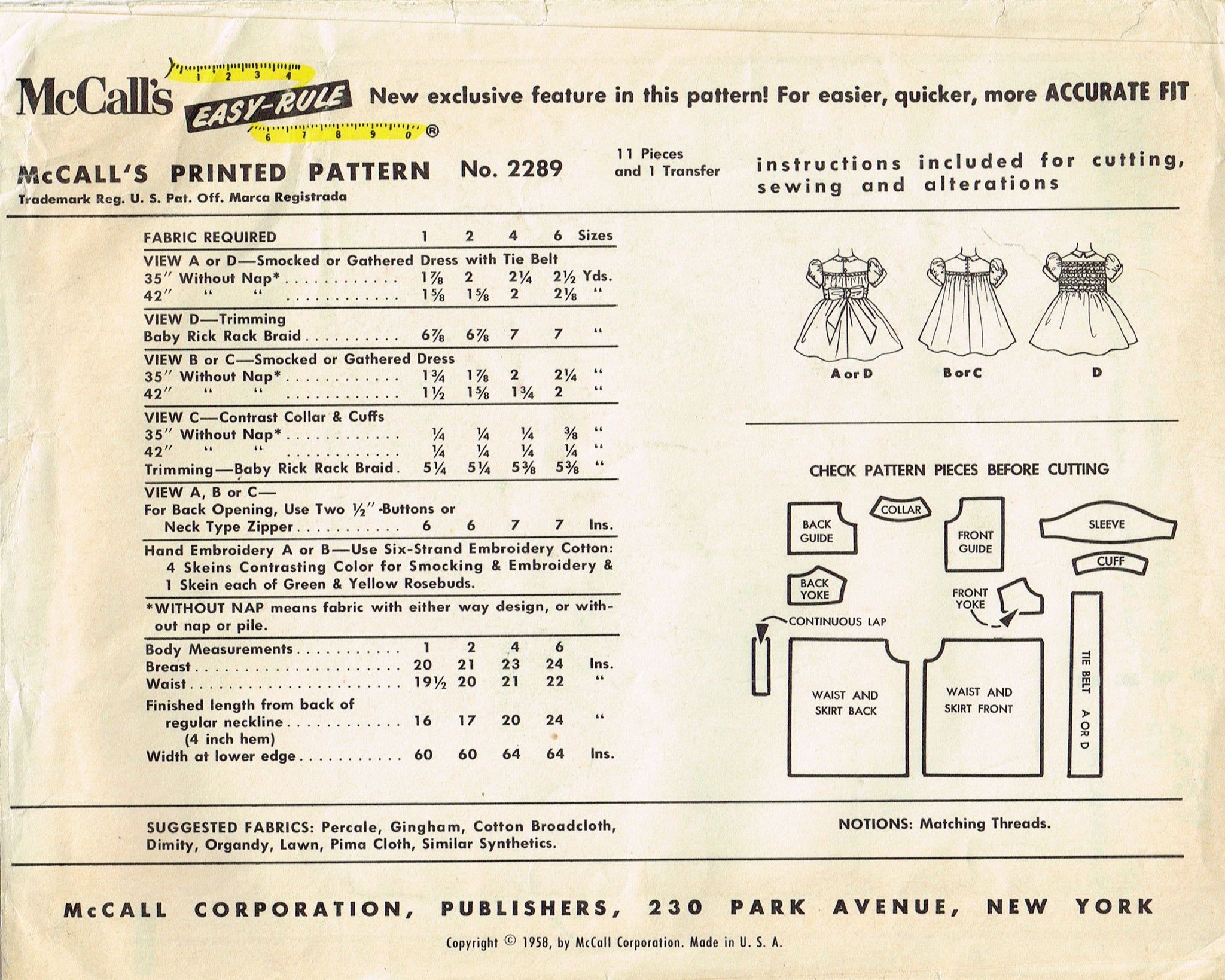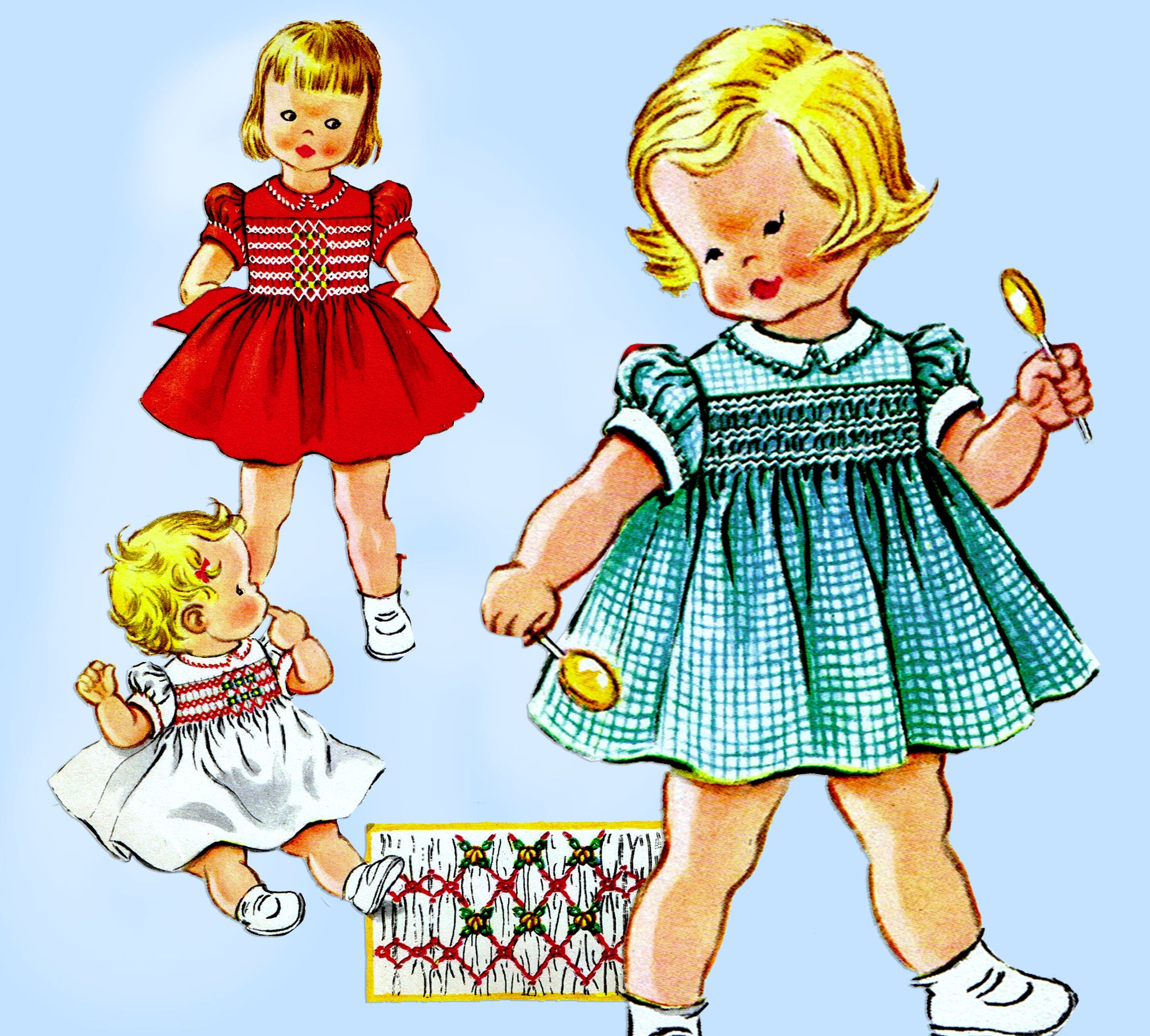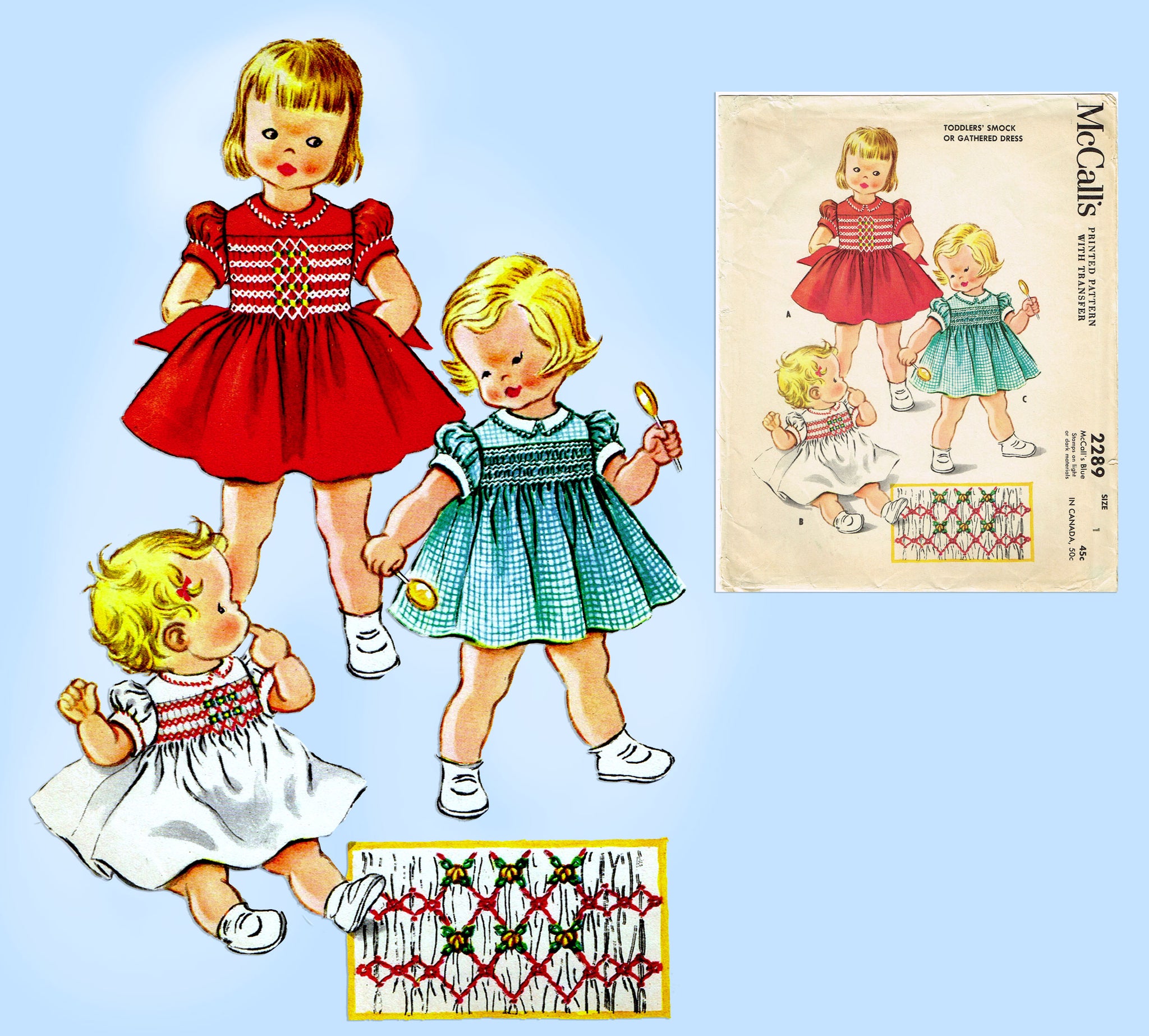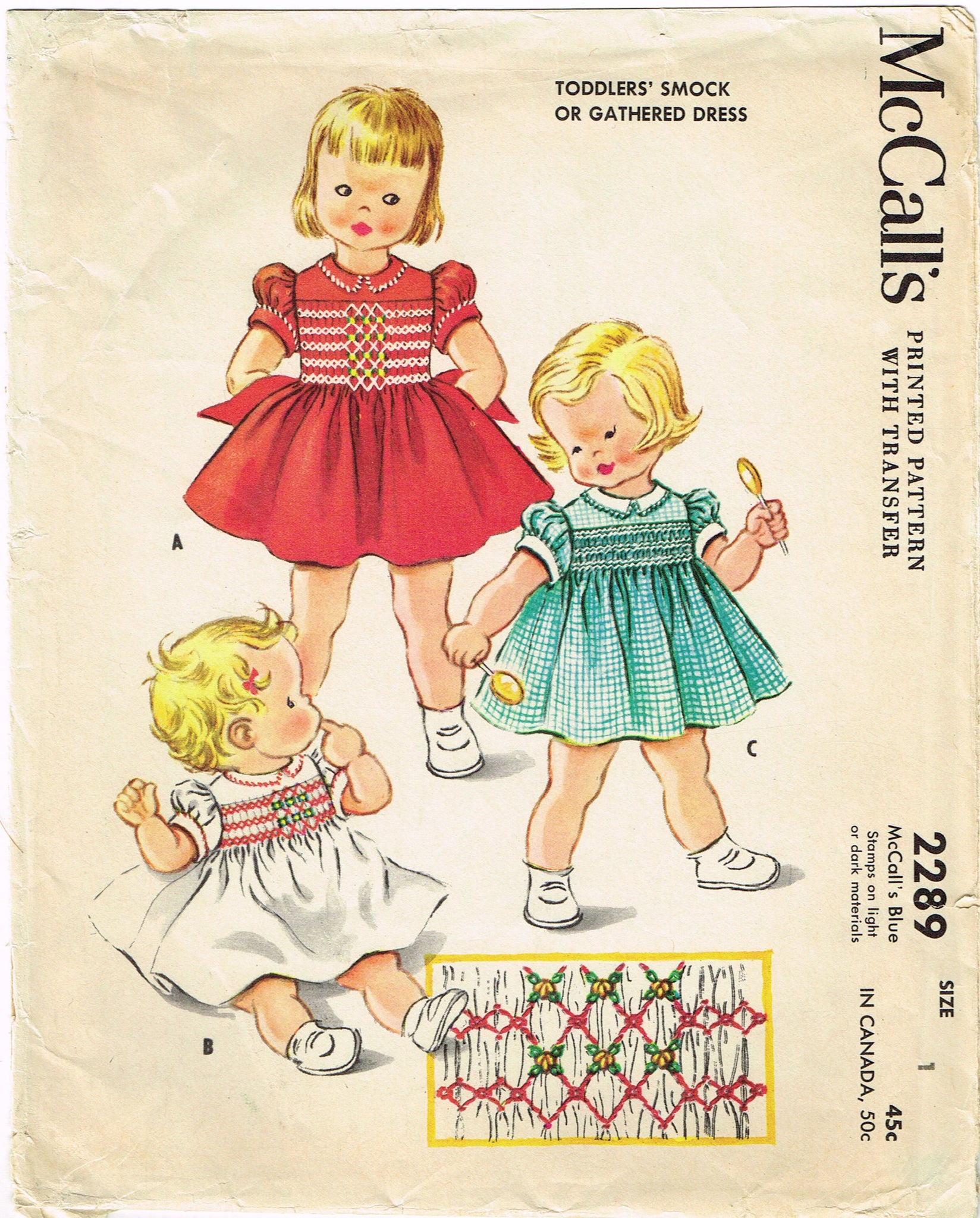 McCall's 2289: 1950s Cute Baby Girls Smocked Dress Sz 1 Vintage Sewing Pattern
