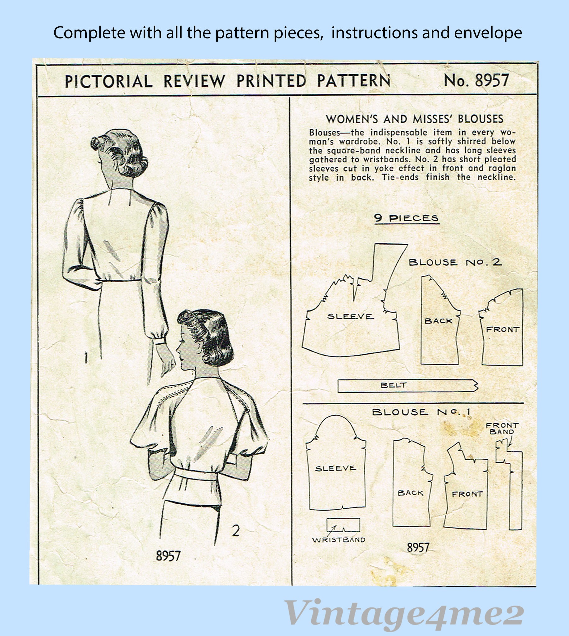 Pictorial Review 8957: 1930s Blouse 34 B Vintage Sewing Pattern Unusual Sleeve