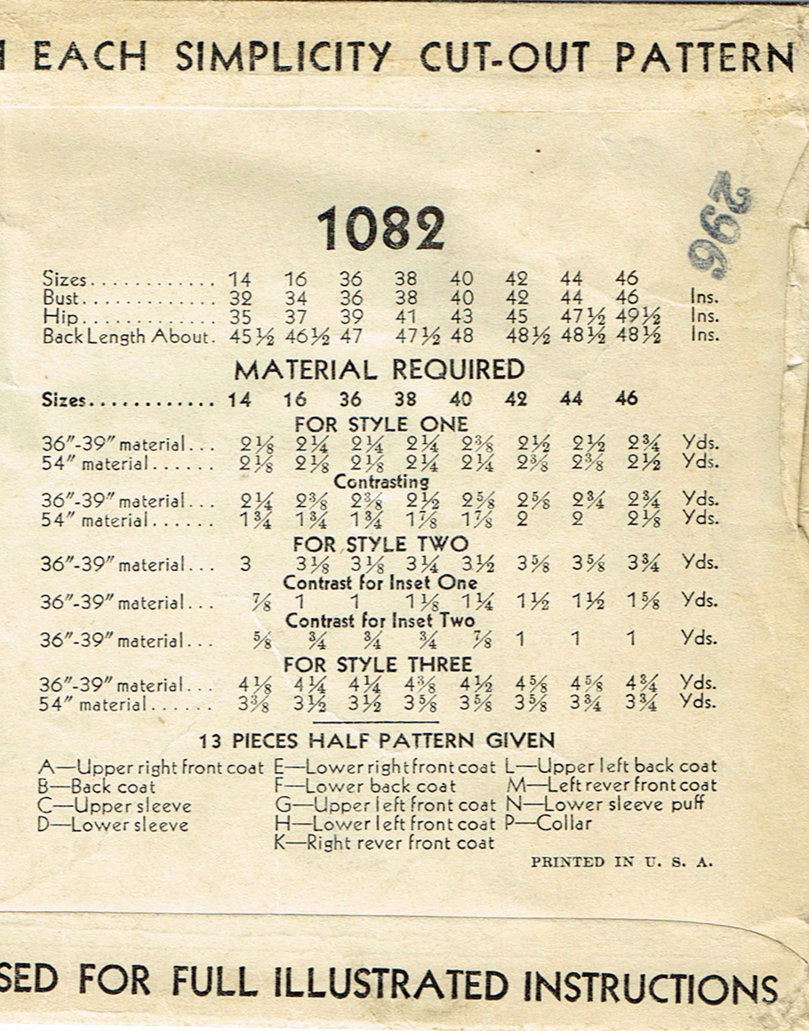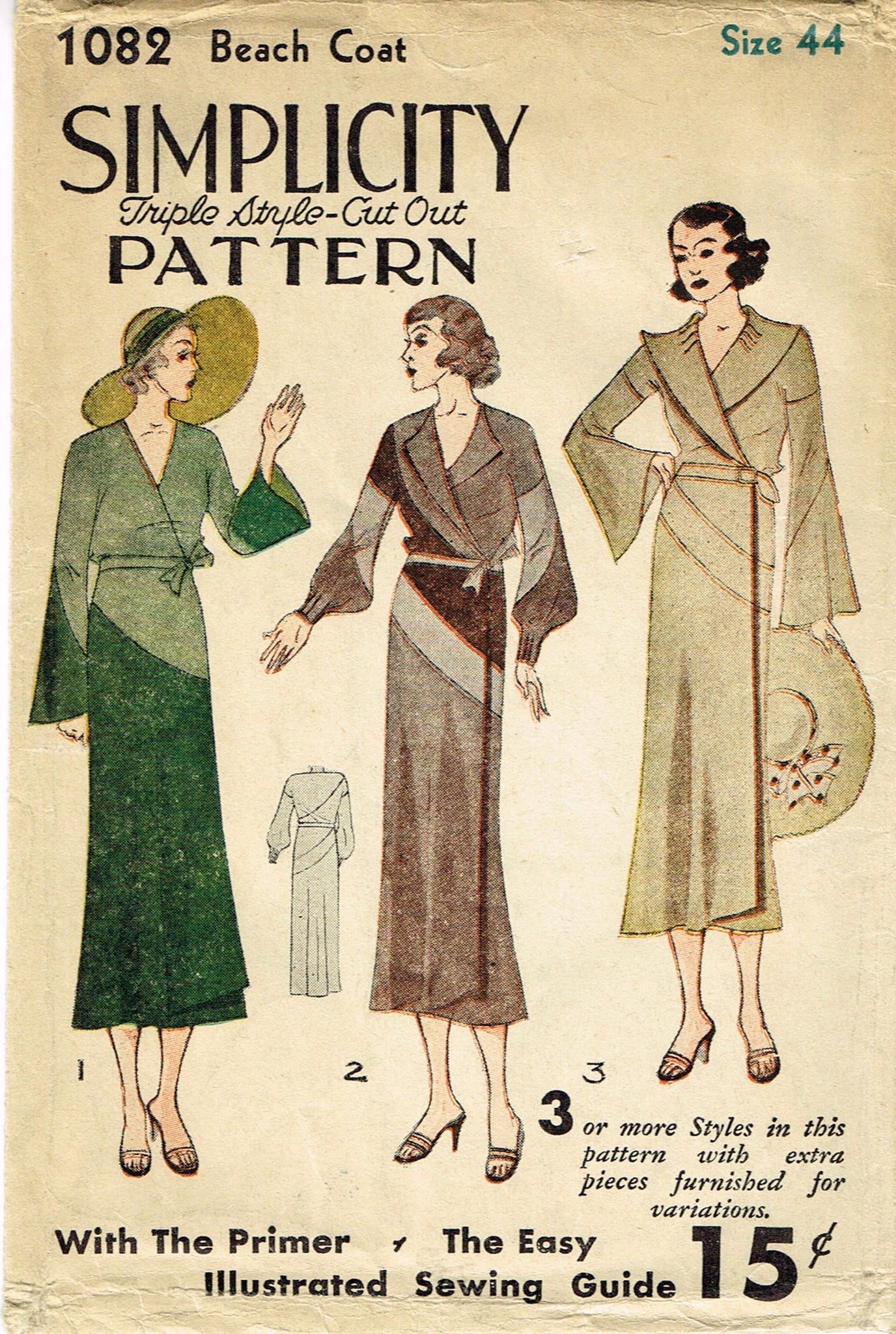 Simplicity 1082: 1930s Rare Uncut Plus Size Beach Coat 44 B VTG Sewing Pattern
