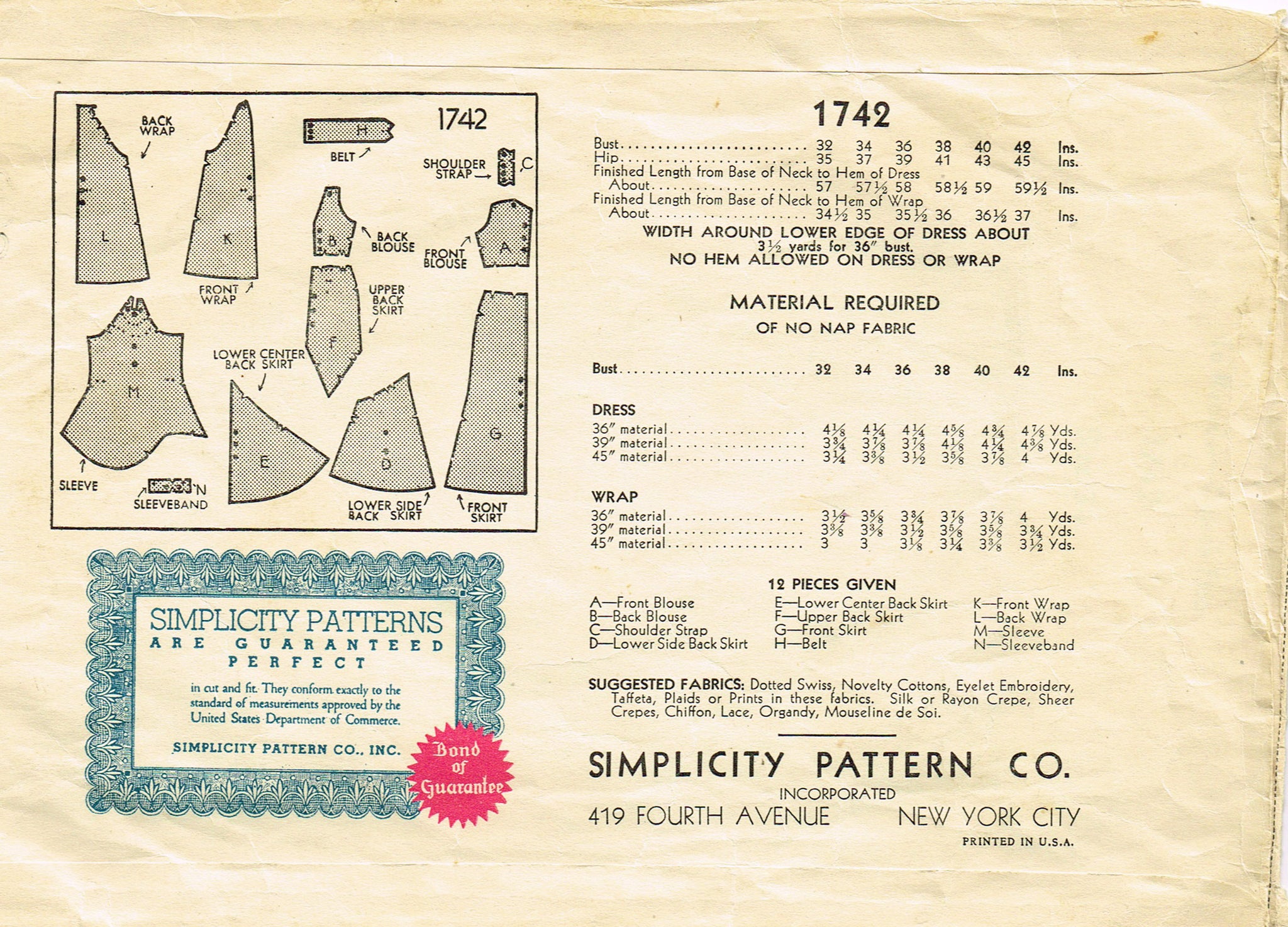 Simplicity 1742: 1930s Rare Evening Gown & Coat Size 34 B Vintage Sewing Pattern