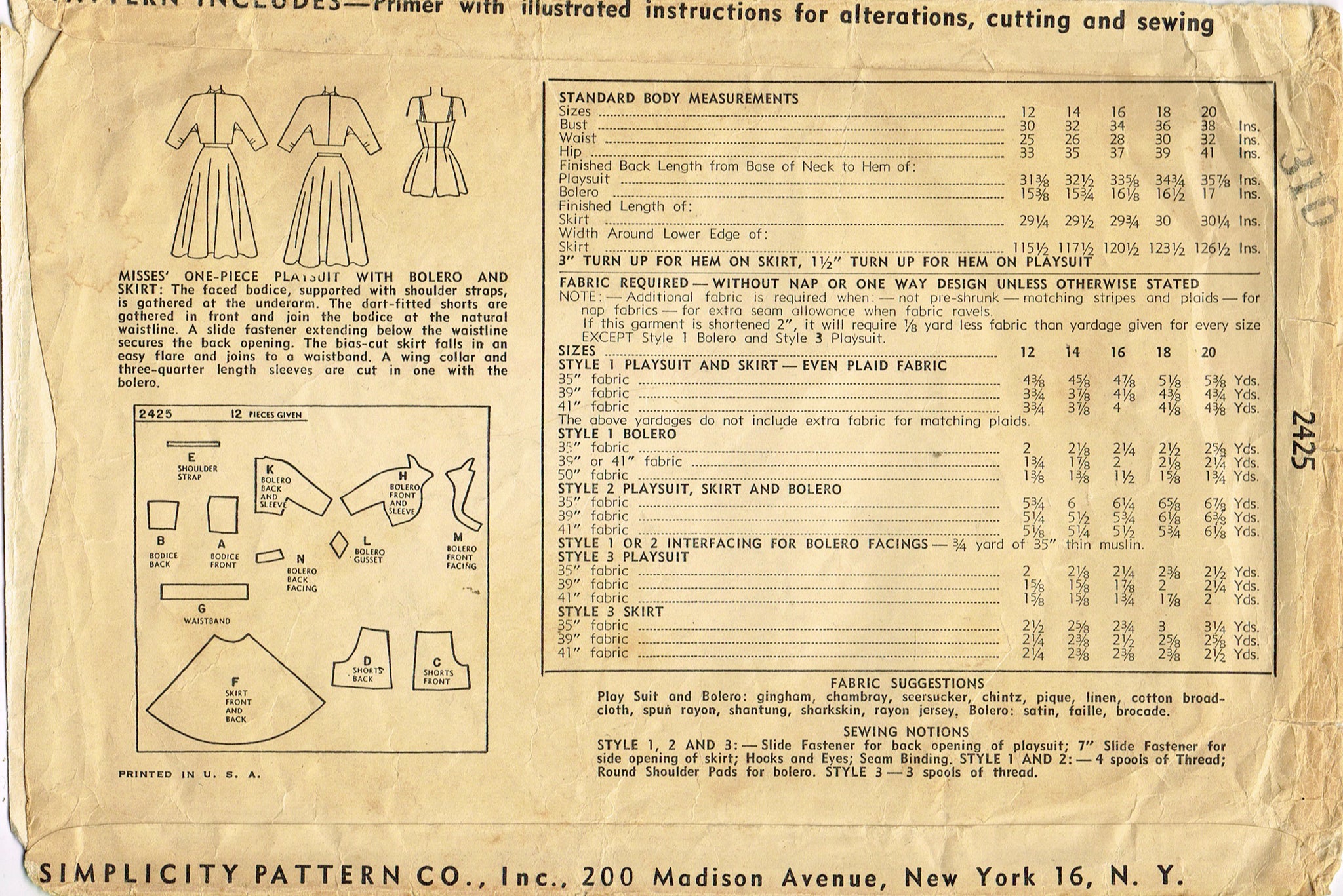 Simplicity 2524: 1940s Cute Misses Playsuit & Skirt 34 B Vintage Sewing Pattern