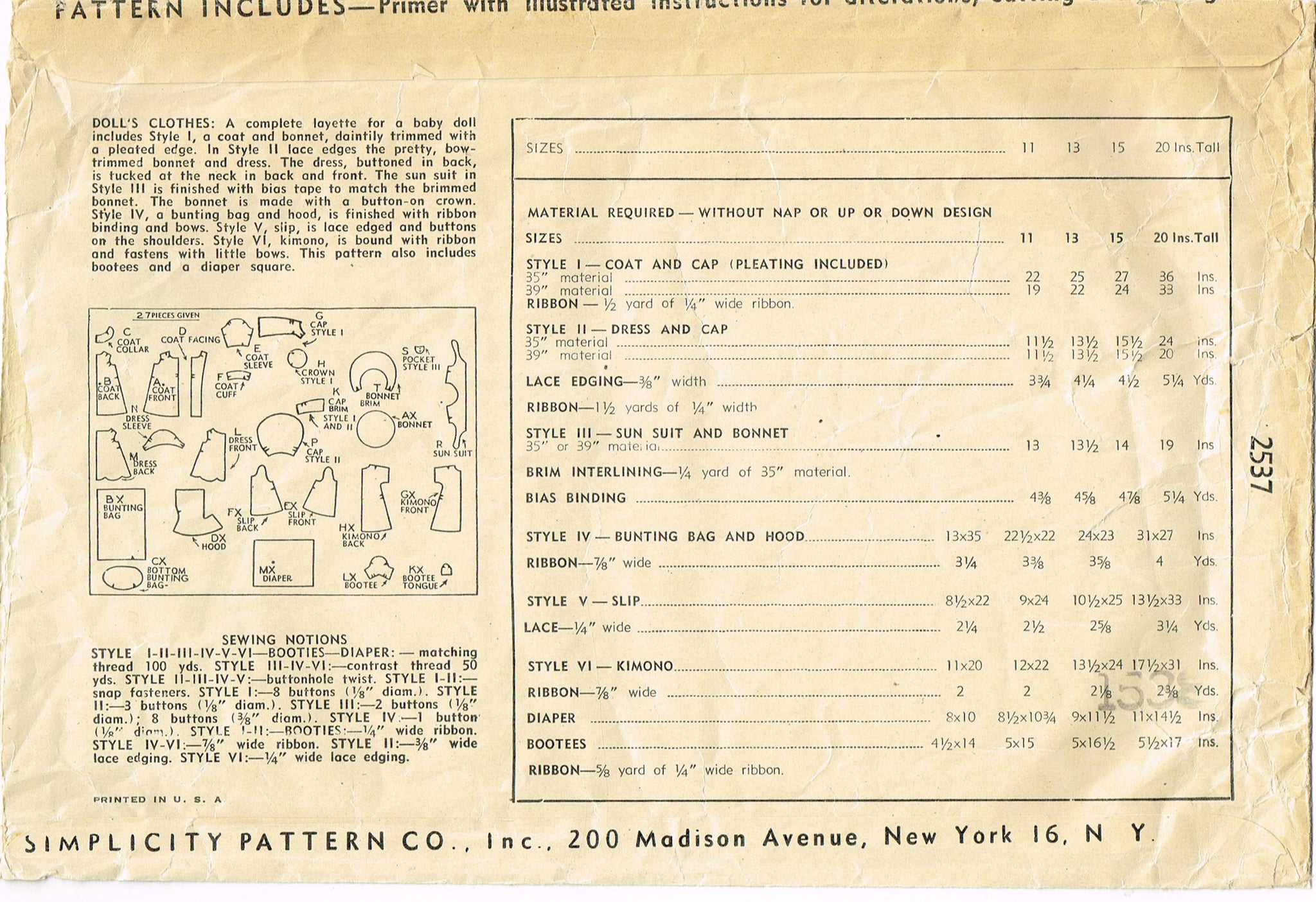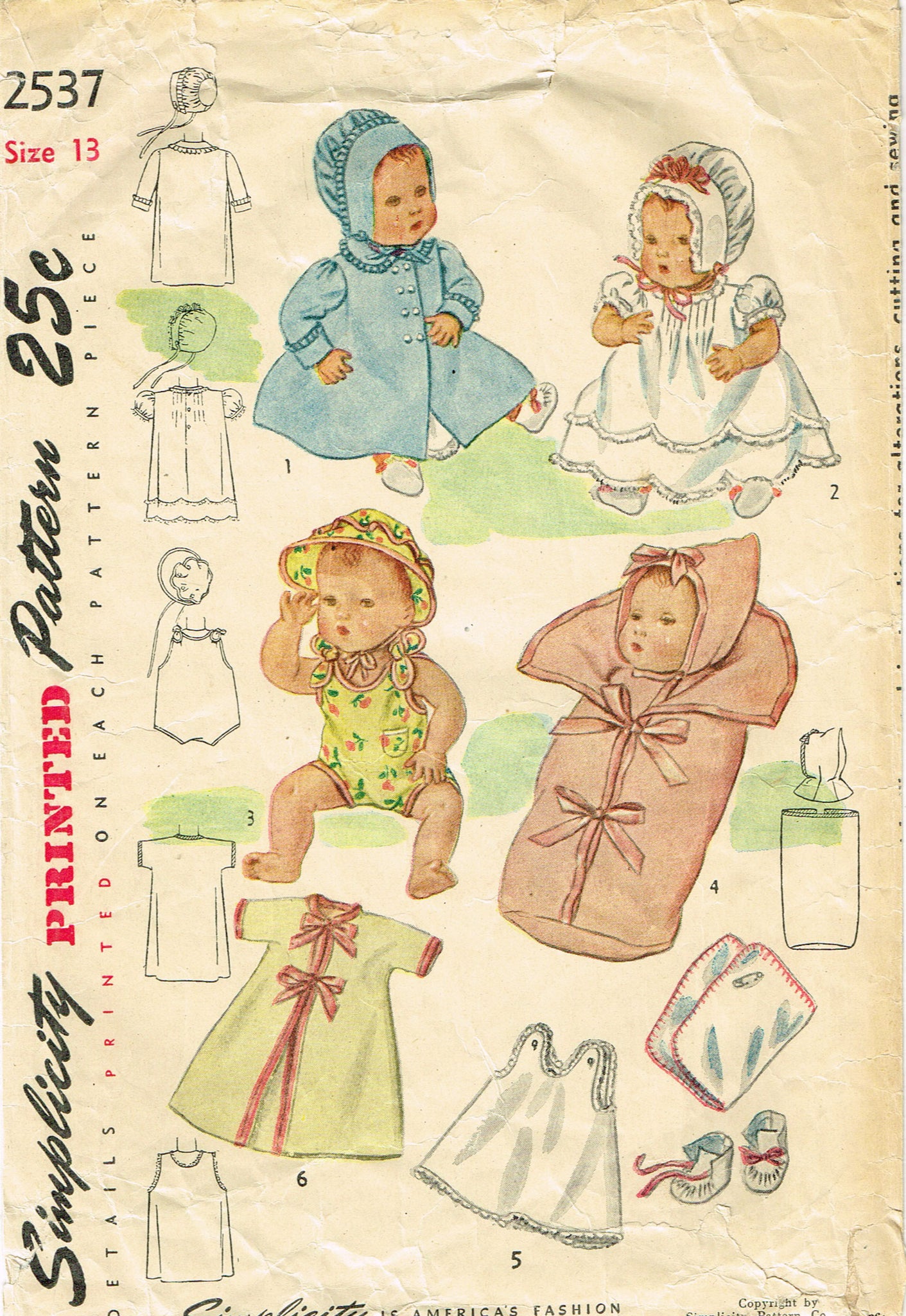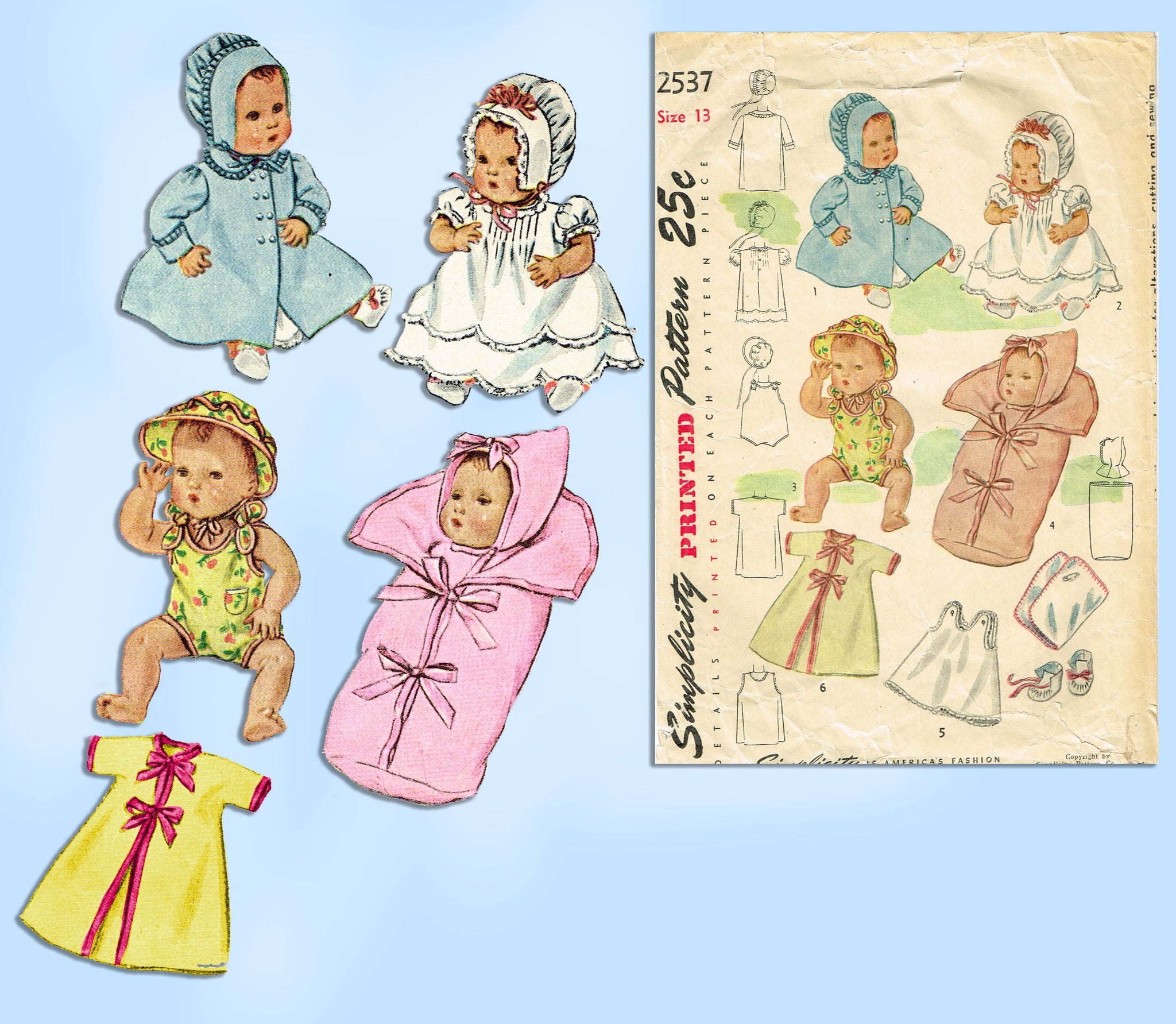Simplicity 2537: 1940s Sweet 13inch Baby Doll Clothes Set Vintage Sewing Pattern