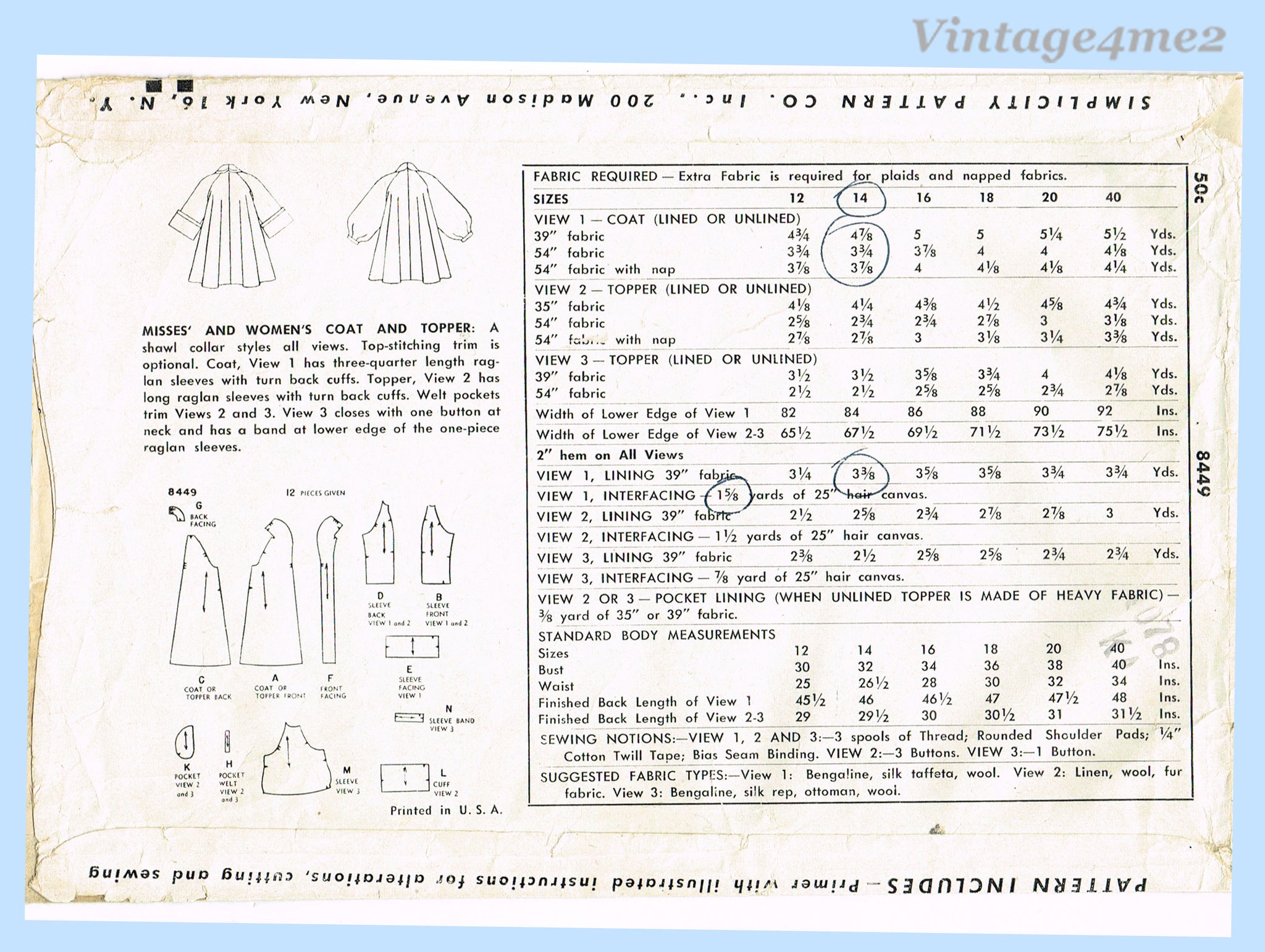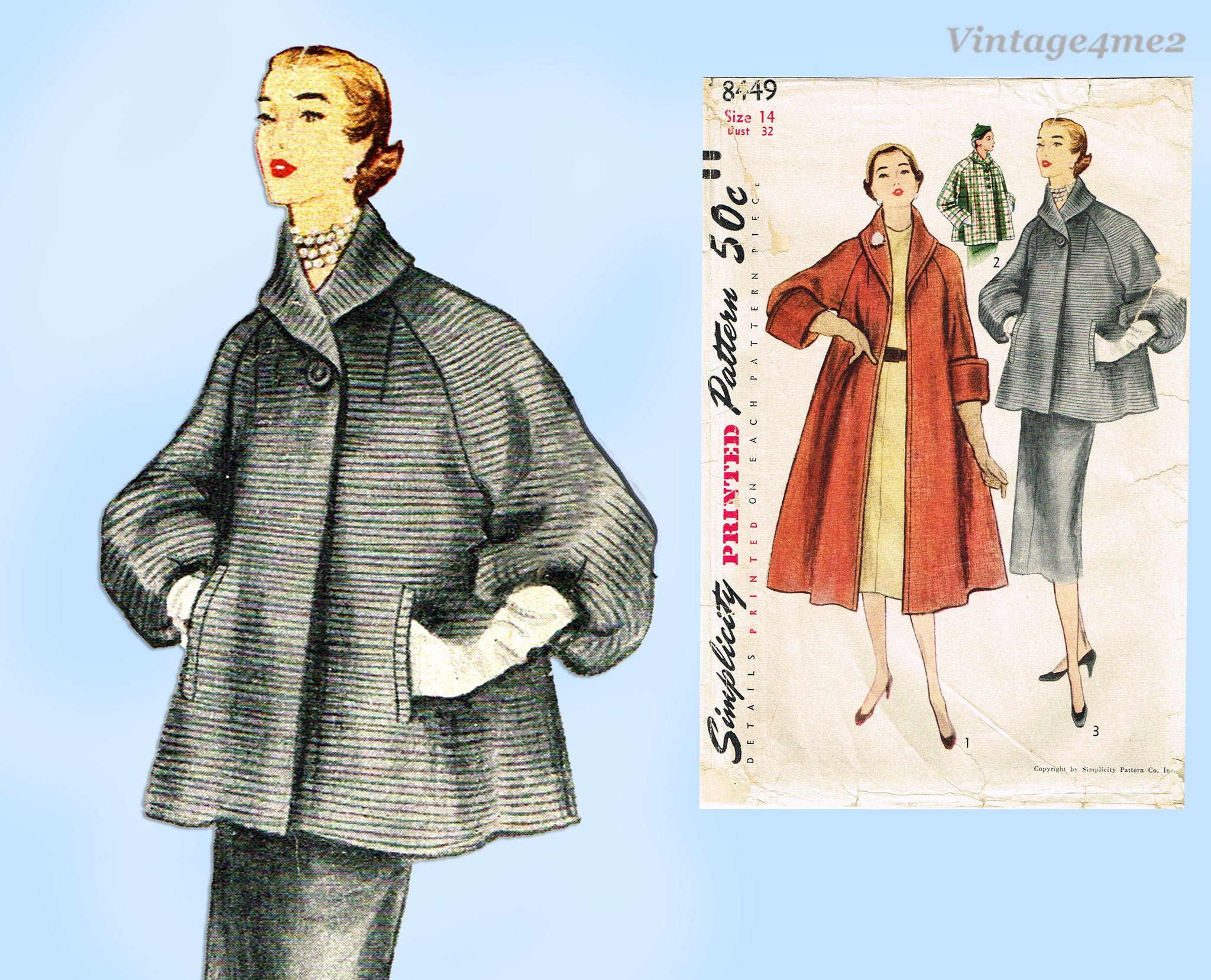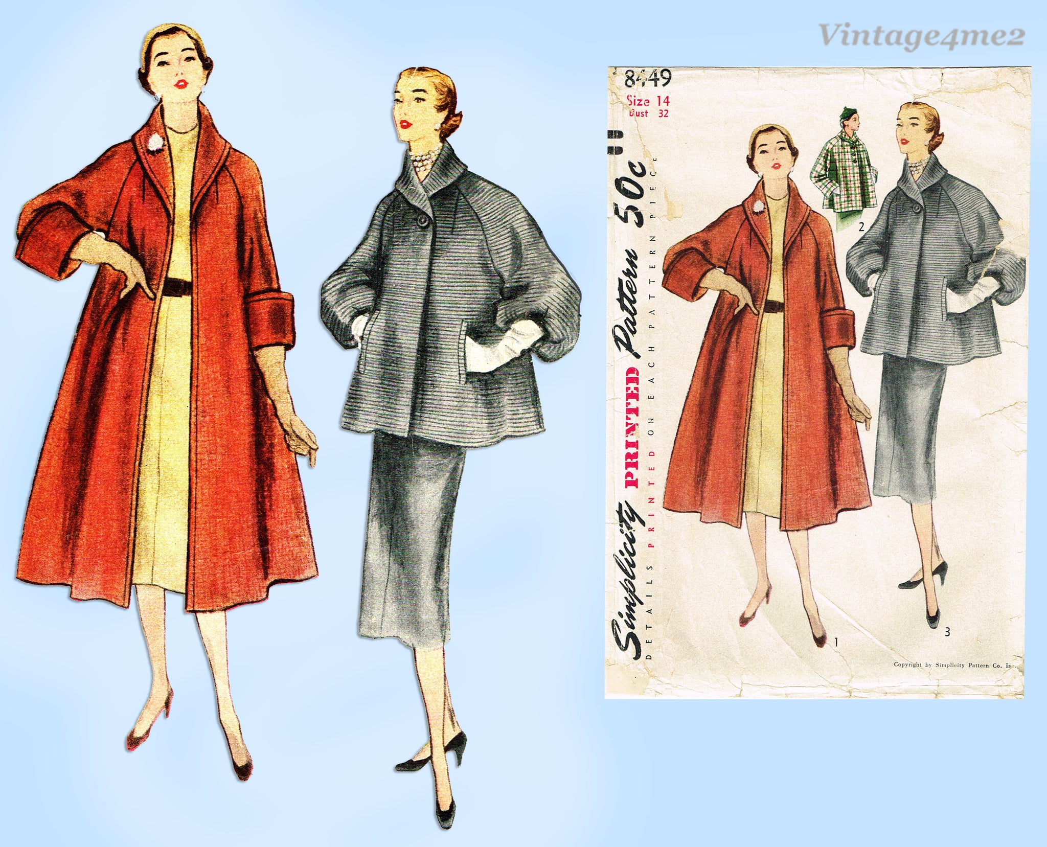 Simplicity 8449: 1950s Rare Misses Swing Back Coat Sz 32B Vintage Sewing Pattern