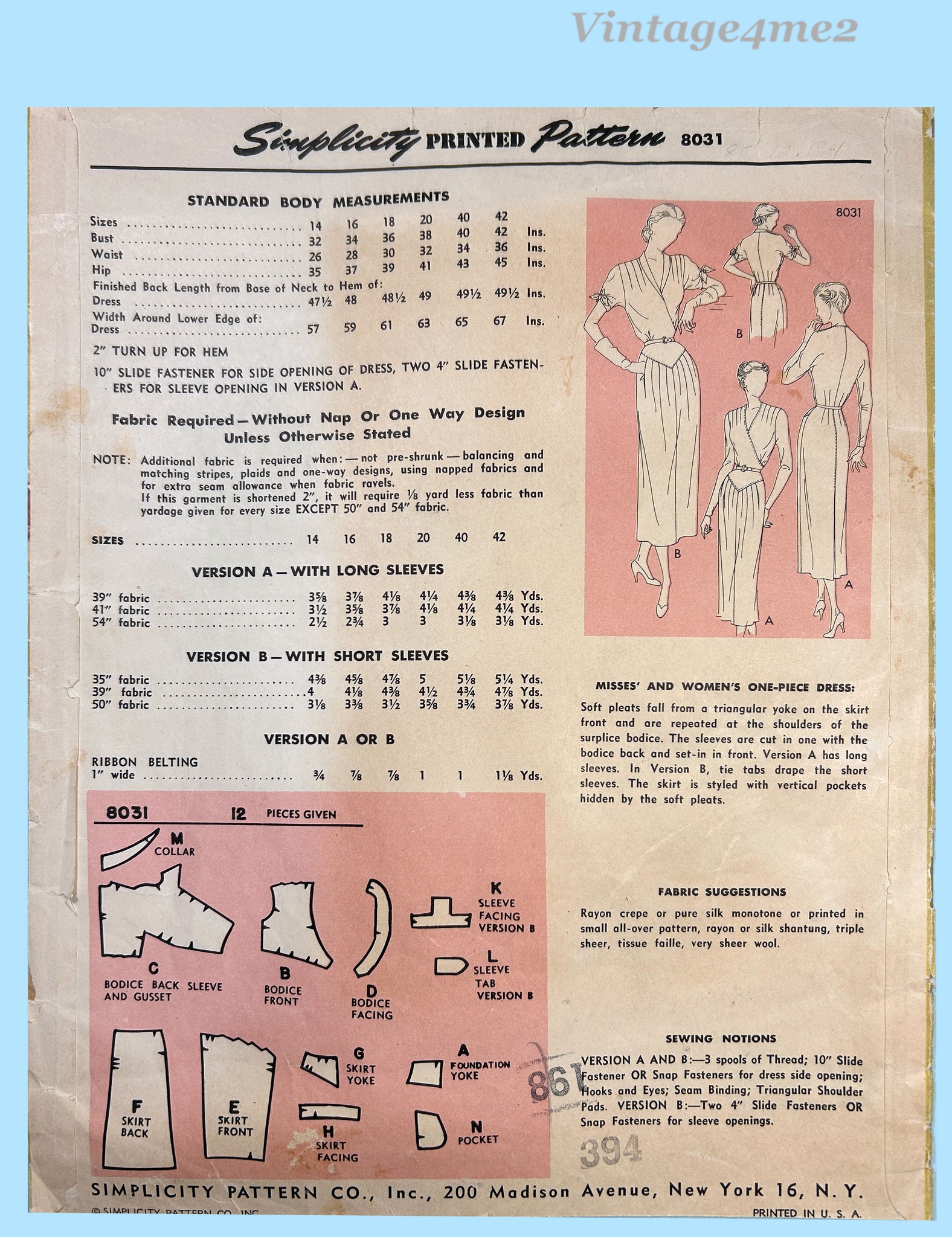 Simplicity Designer 8031: 1940s Uncut Misses Cocktail Dress 40 B Vintage Sewing Pattern